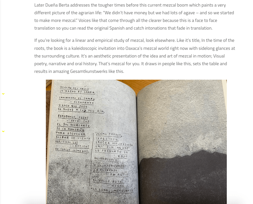 Time in the Roots & Rezpiral – interpretation and valuation by Max Garrone of Mezcalistas June 29, 2020June 29, 2020 by alxwyt “It’s an aesthetic presentation of the idea and art of mezcal in motion; Visual poetry, narrative and oral history. That’s mezcal for you.” https://mezcalistas.com/the-roots-of-mezcal/ Share this: Click to share on X (Opens in new window) X Click to share on Facebook (Opens in new window) Facebook Like Loading... Related