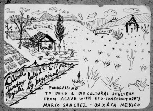 Construcción de una casa (palapa de sombra) estructura de morillos, y techo de quiotes secos y pencas de maguey espadin. La palapa sirve como espacio de sombra y convivencía en nuestro vivero y como un ejemplo demonstrativo para campesinos mezcaleros y otros que tienen tal recursos naturales y quien lo puede querer copiar. Imaginado por Alex White Mazzarella inspirado gracias a la influencia de mezcaleros y colaboradores. Diseño y creación realizado por Marcos Sanchez, construido por Tai y Conejo del colaborativo Eco-Constructores de Oaxaca. Apoyado de los bienes comunales de Santa Maria del Tule.