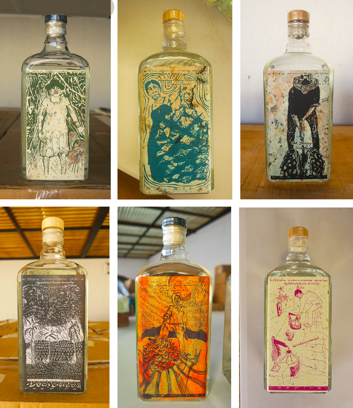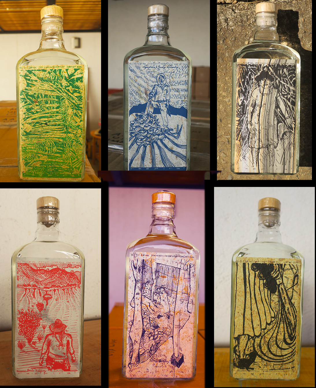 2021, series #6. Twenty-seven complex artisanal small batch agave spirits. From Berta Vasquez of San Baltazar Chichicapam, 90 liter batch of of Tobala/Cuish, 63 liter batch of Tepextate & Coyote, 108 liter batch of Mexicano/Espadin/Tepextate, a 90 liter batch of Tepextate sourced from Palmar, a 76 liter batch of Cuish Capón, and a 100 liter batch of Coyote. From Aureliano Hernandez of San Baltazar Guelavila an liter batch of Pechuga de Café, a 300 liter batch of Arroqueño and 170 liter batch of Lumbre. From Tio Chico of San Luis Amatlán a 400 liter batch of Verde, and a 70 liter batch of Cucharillo. From Simeon Ramirez of San Agustin Amatengo a 108 liter batch of Piñuela, a 100 liter batch of Tobaziche, a 100 liter batch of Tepeztate, a 100 liter batch of San Martinero, and a 100 liter batch of Espadín de Lluvias. From Reina Sanchez of San Luis Amatlan, a 330 liter batch of Espadín, a 270 liter batch of Madrecuish, a 150 liter batch of Arroqueño, a 200 liter batch of Tepextate, and 180 liter batch of Cuish/Madrecuish. From Alejandrina & Nicolas Hernandez of Rio Seco Zoquitlan, a 190 liter batch of Espadin, a 200 liter batch of Espadín de Lluvias, and a 245 liter batch of Bilía/Tepextate/Cuishe and Espadín. From Leo of San Baltazar Guelevila, a 280 liter batch of Coyote & Tobala, a 220 liter batch of Tepextate and Jabali, and a 220 liter batch ensamble de 7 of Lumbre/Tobaziche/Espadin/Tepextate/Tobala/Cuishe/Coyote. Labels in this series were created from ink illustrations, digitalized and silk screen printed on Amate paper.